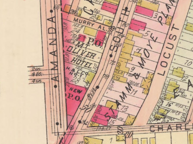 The post office in Mount Oliver has been peripatetic if we take a long-term view. It began a few doors north of here on Brownsville Road in a little brick building later replaced by a furniture store. In about 1905, this substantial “flatiron” building went up at the complicated intersection of Brownsville Road, Amanda Street/Avenue (the border between Mount Oliver, which calls it an avenue, and Pittsburgh, which calls it a street), Bausman Street, Sherman Avenue, and Hays Avenue.