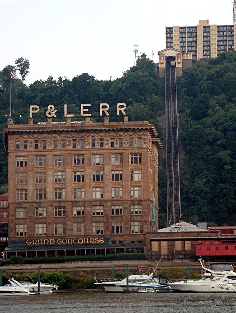 The old Pittsburgh and Lake Erie station, now the centerpiece of the Station Square entertainment district, with the Monongahela Incline in the background.