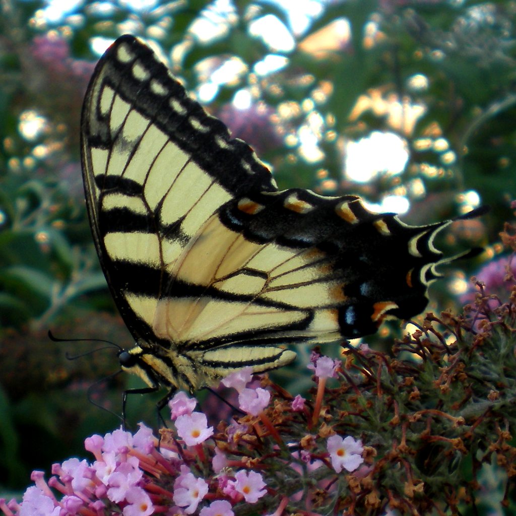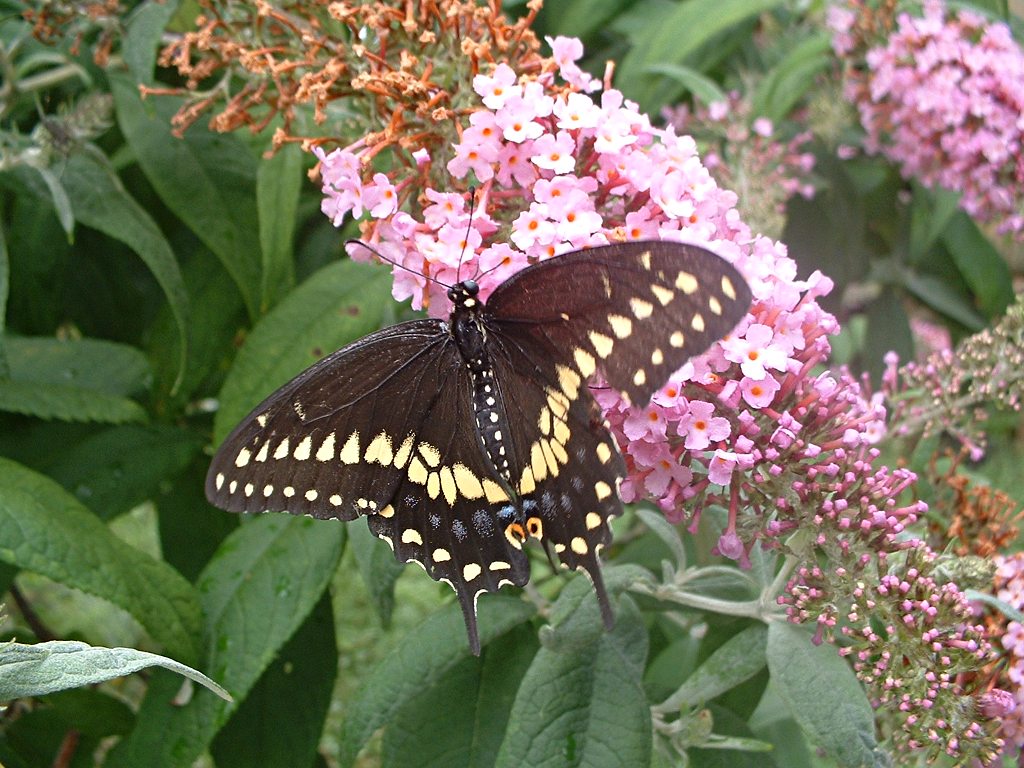 A Black Swallowtail (Papilio polyxenes) visits the flowers of a Butterfly Bush (Buddleia davidii) in Beechview. If you like butterflies, a butterfly garden is easy to put together and beautiful in its own right. The Butterfly Bush is a good start; milkweeds (Asclepias spp.) and coneflowers (Echinacea spp.) will also bring crowds of butterflies.