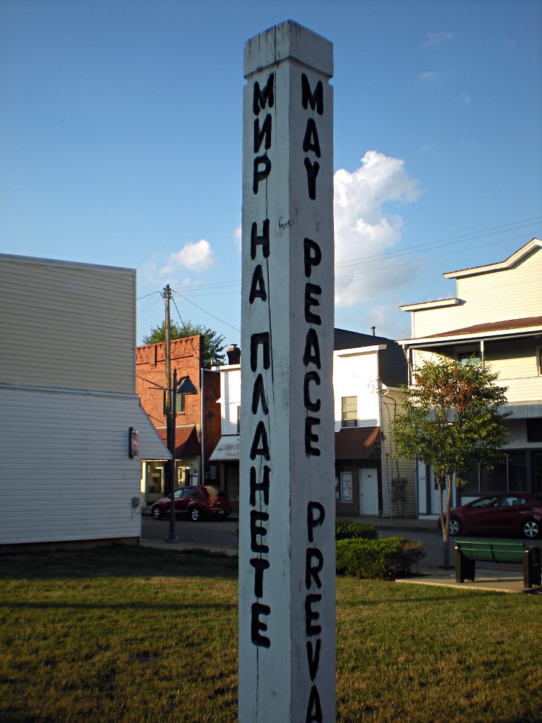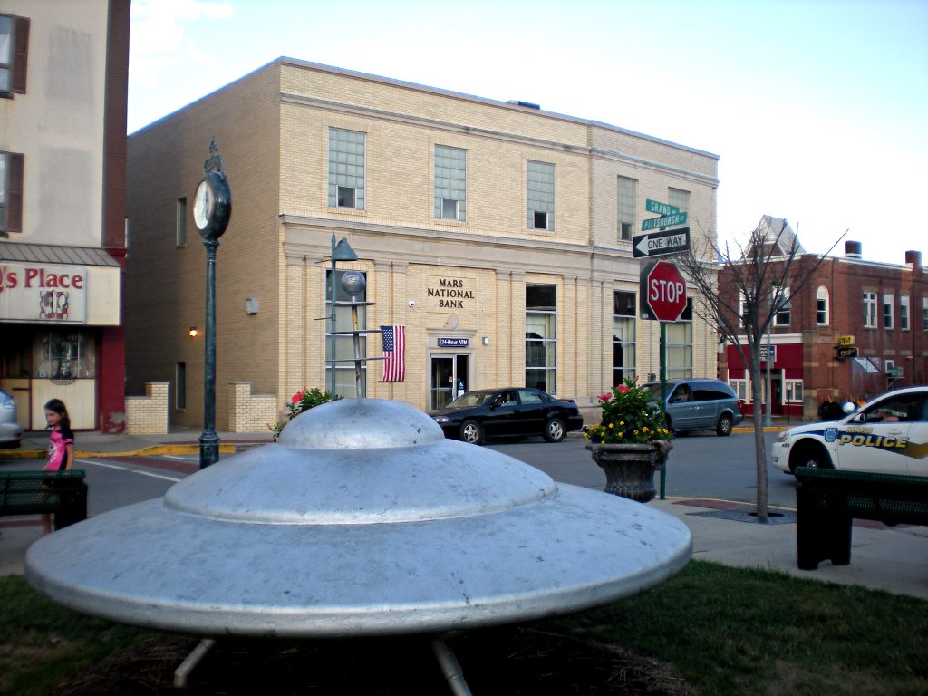 Almost due north from Pittsburgh is a little town called Mars, where you’ll find a flying saucer in the center of town, and beside it a peace post with the words “May peace prevail on earth” and similar sentiments in French, Spanish, and Russian engraved on the four sides.