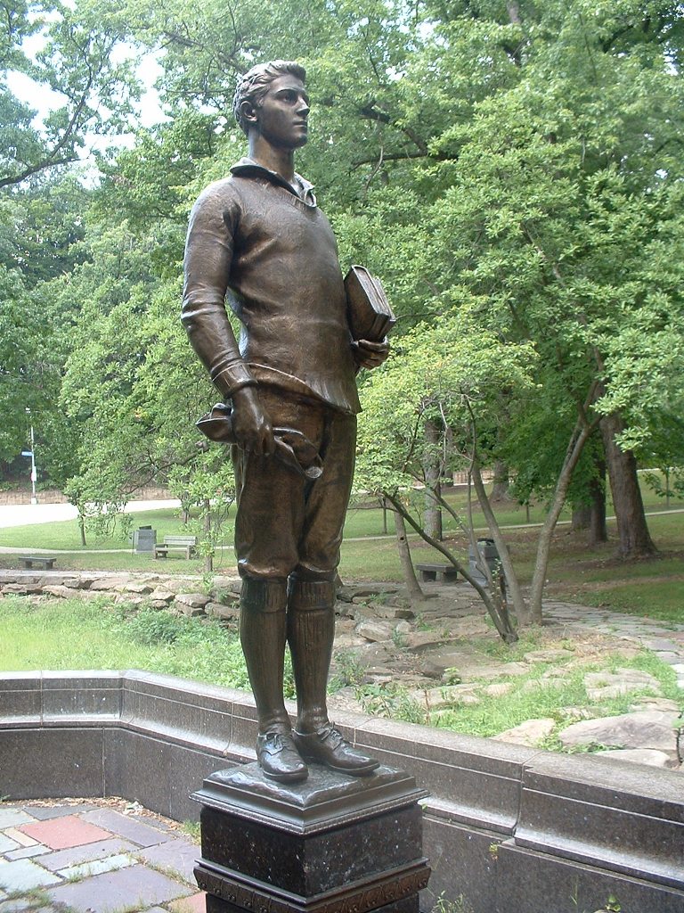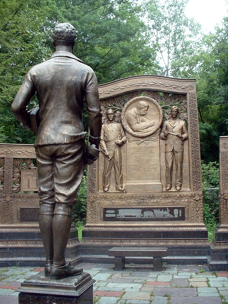 This cast of Beaux-Arts titans could have made a heroic statue of George Westinghouse riding an air brake, but they decided on something more subtle. The monument is a beautiful allegory. An all-American boy (surely one of French’s best works) stands in the prow of a boat, his hat in one hand and books in the other, and learns about the incredible accomplishments of the genius Westinghouse, opened up in front of him like a scroll. You can read the wonder on his face, and in the careless way he crumples his hat, as if he had completely forgotten it was in his hand. (Notice how his sweater is pushed up from all that absentminded fiddling with the hat.) The message is clear: future generations will judge Westinghouse by his fruits, and they will be astounded.